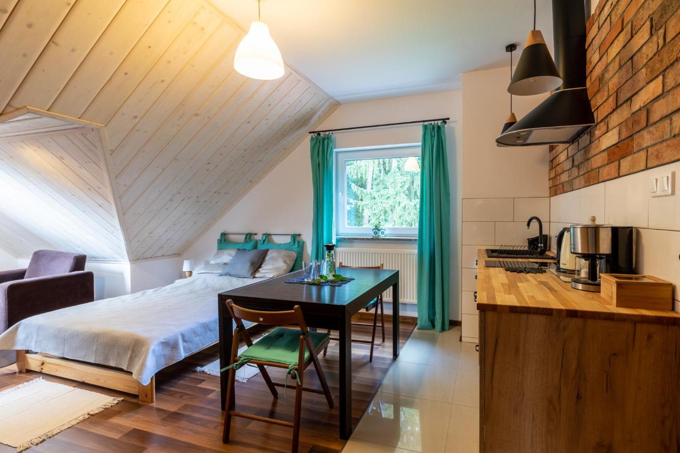 Rodzinny apartament typu Studio. The studios kitchenette is available for cooking and storing food. The studio offers a wardrobe, heating, a balcony with mountain views as well as a private bathroom featuring a shower. The unit offers 3 beds. Studio - 6 osobowy. Powierzchnia pokoju ok.: 45 mkw.